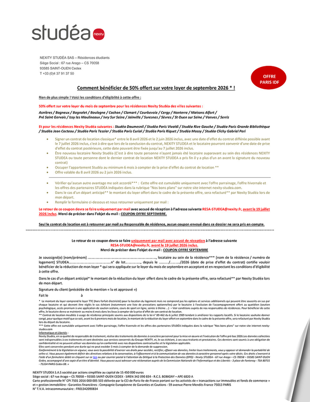 Dans le cas d’un départ anticipé* le montant de la réduction du loyer offert dans le cadre de la présente offre, sera refacturé** par Nexity Studéa lors